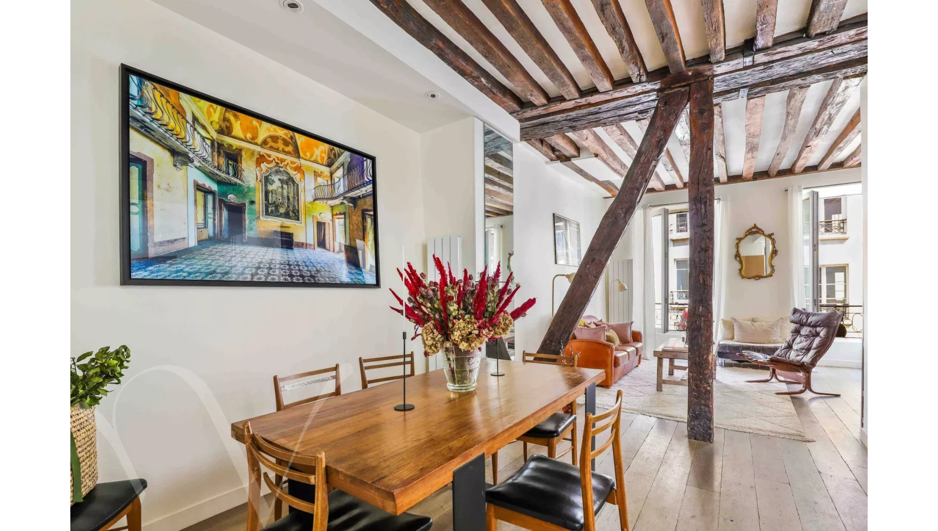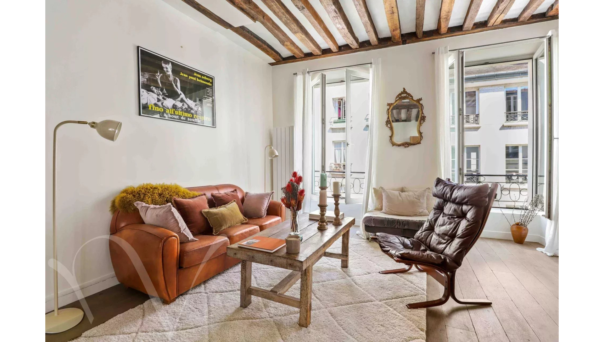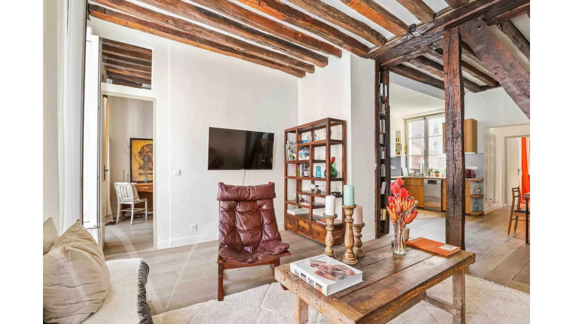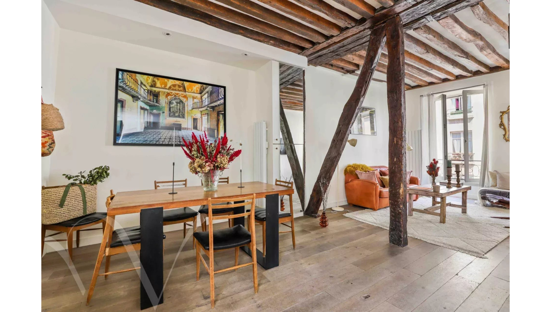 Exclusivité. Situé au 3e étage sans ascenseur d'un immeuble de la fin du XIXe siècle, cet ravissant appartement de 61 m² est niché dans le quartier prisé des Archives, au cœur du 3e arrondissement de Paris. Il se compose d'un beau salon, d'un agréable espace salle à manger avec cuisine ouverte et, de part et d'autre des pièces de réception, des deux chambres lumineuses. Il comprend enfin une salle d'eau et des toilettes séparées. Un mélange de modernité et de charme avec ses poutres apparentes et son parquet chaleureux.