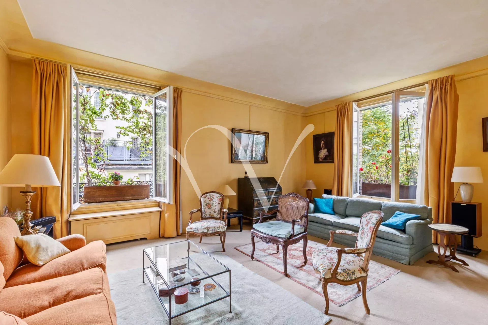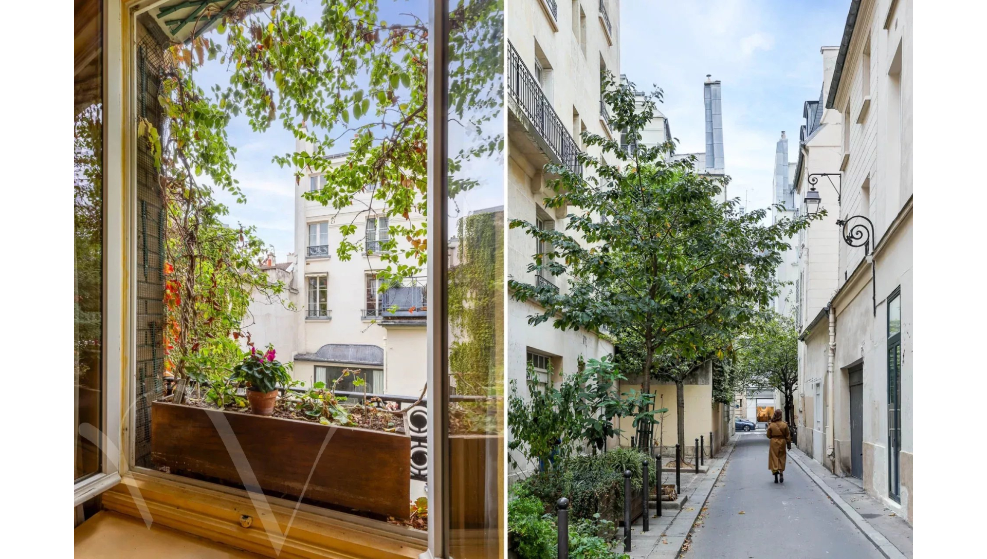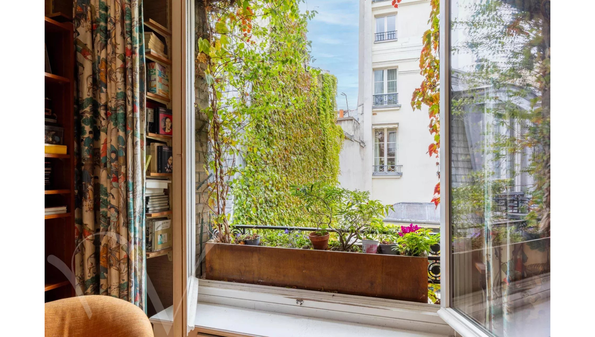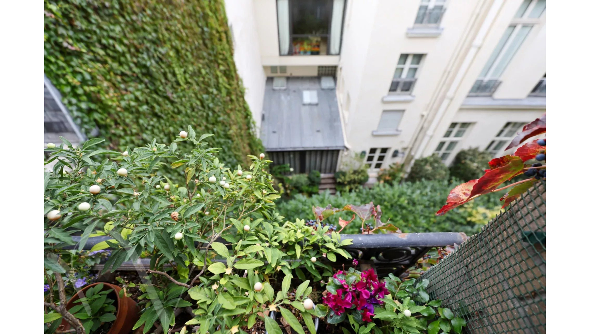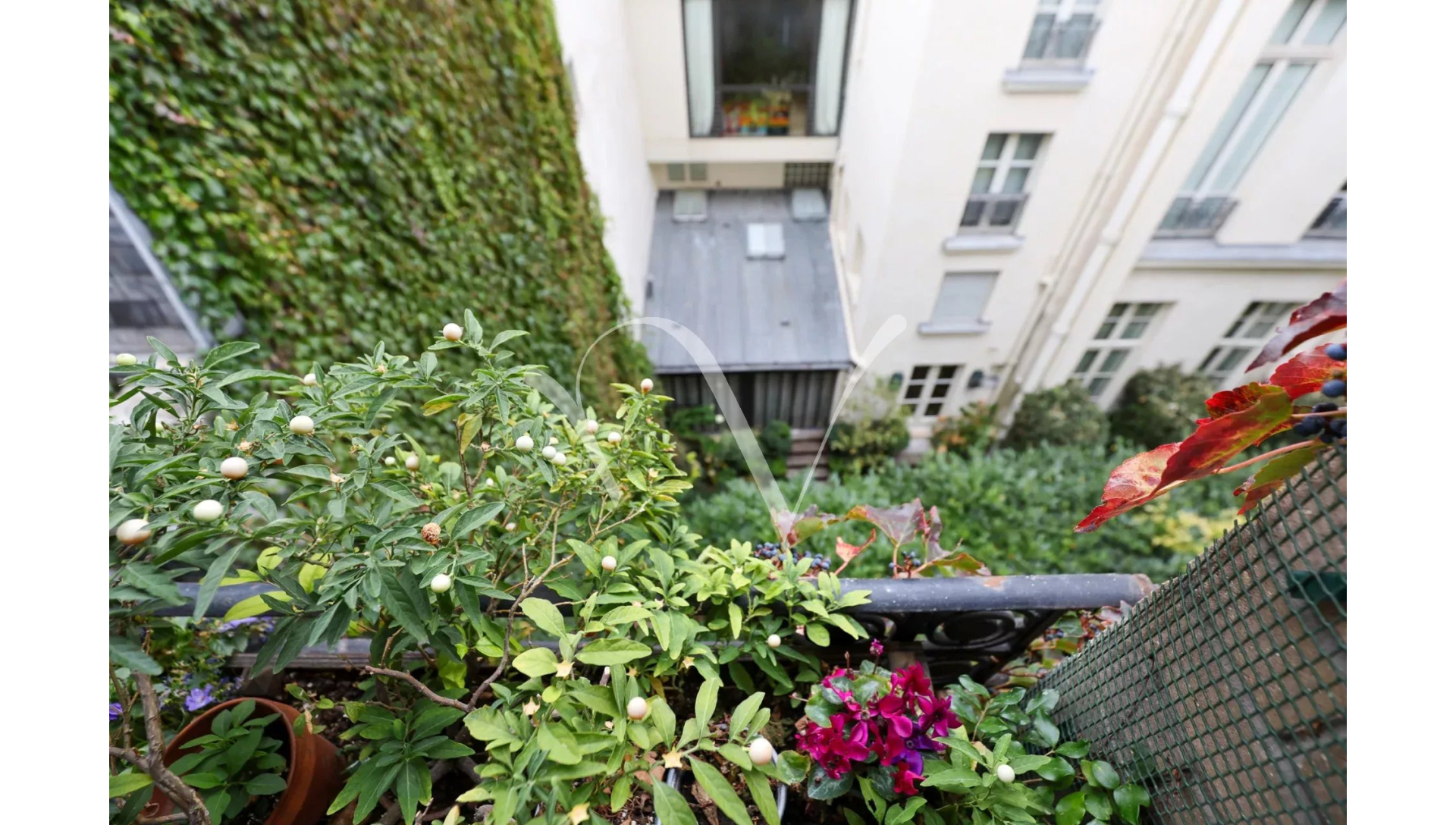 L'appartement est au calme absolu, il donne entièrement sur des jolies cours jardins plantées et fleuries.