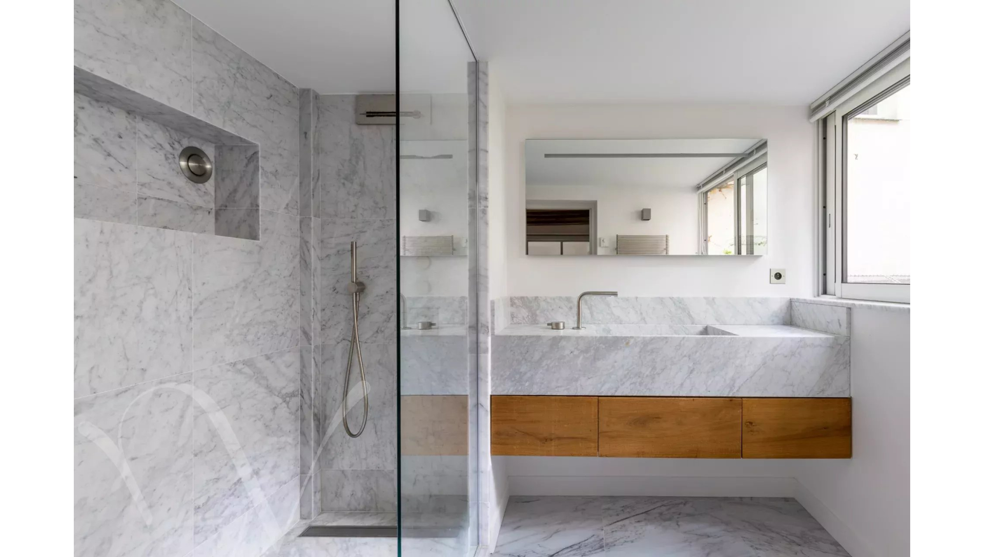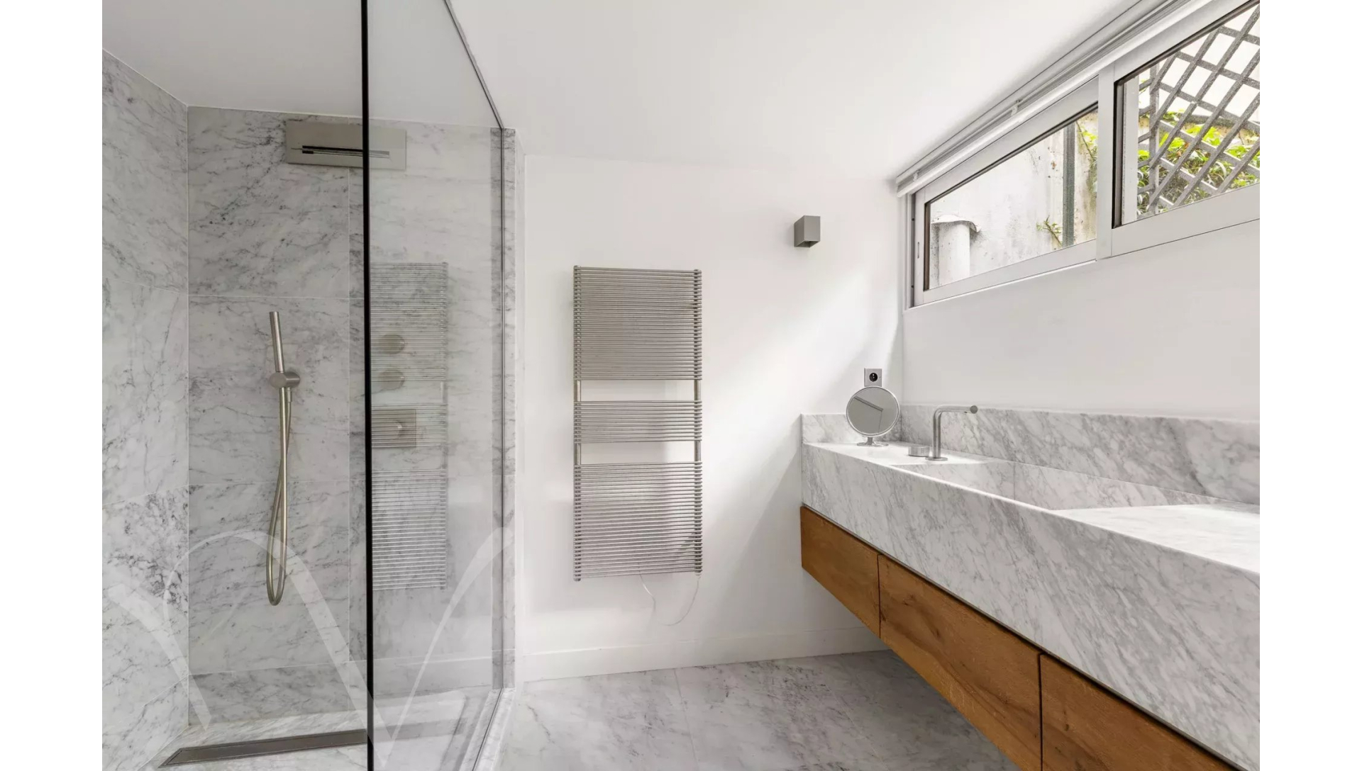 Le plan comprend une entrée, une cuisine salle à manger toute équipée, un salon et deux chambres avec chacune sa salle de bain et toilettes. L'appartement a été très joliment rénové avec des prestations luxueuses (matériaux de qualité, domotique etc.)