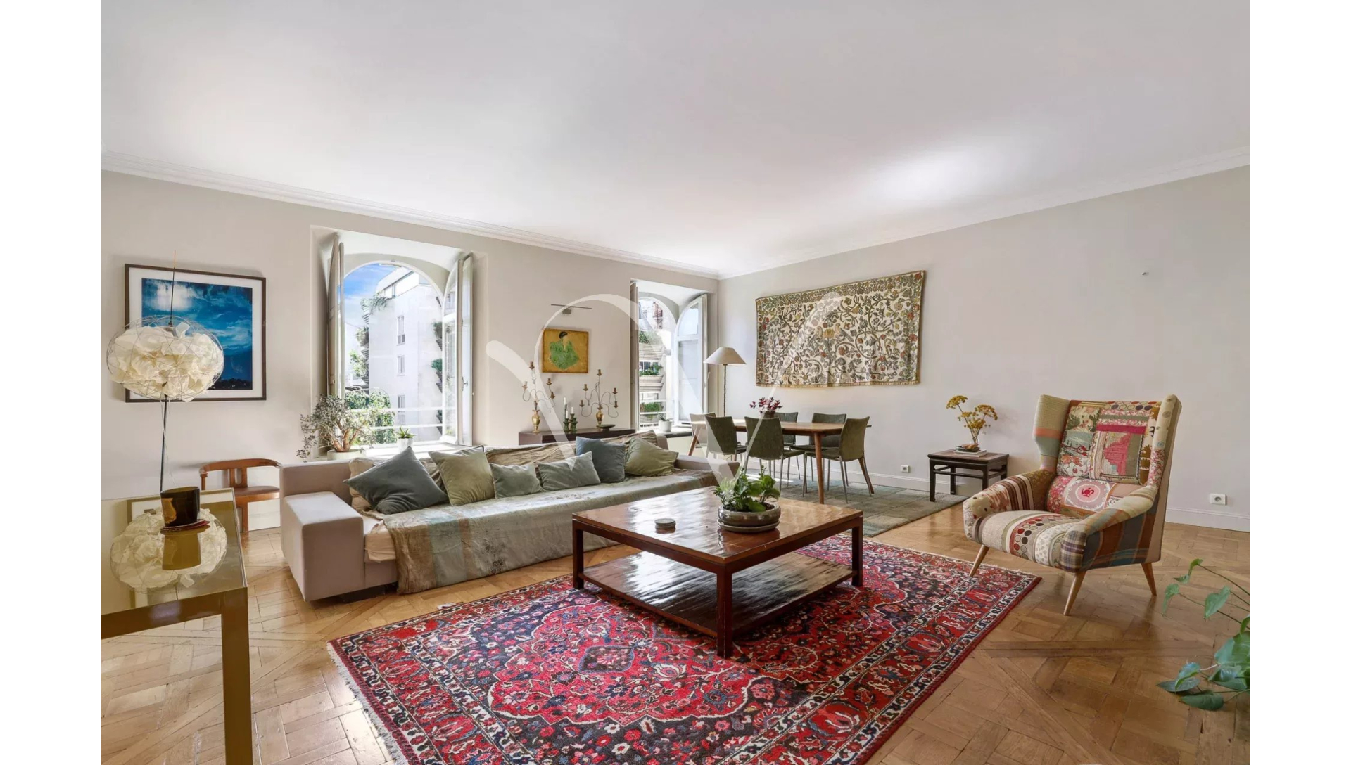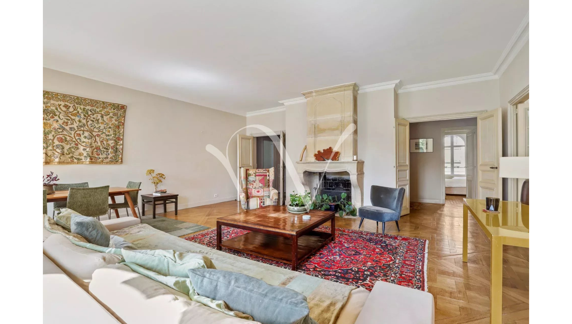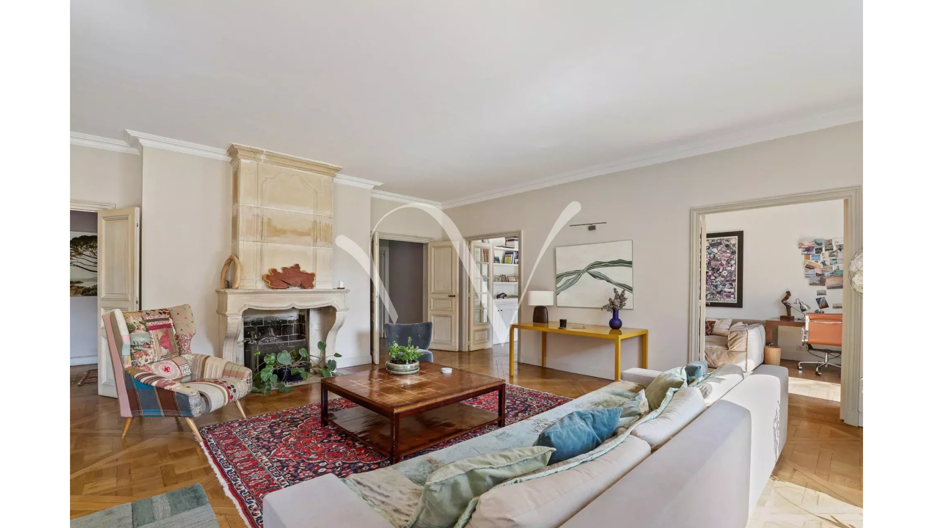Au coeur de Saint Germain des Prés, dans la partie historique de l'Hôtel de Vaudreuil élevé au XVIIIè siècle, au quatrième étage avec ascenseur, un appartement d'une superficie de 213 m² loi Carrez au calme absolu doté d'une vue majeure sur le jardin du square Récamier et sur la cour d'honneur. Il se compose d'une galerie d'entrée, une vaste pièce de réception, un bureau, quatre chambres chacune avec sa salle de bains et toilette, une cuisine aménagée et équipée, un vestiaire invité, une lingerie et de nombreux rangements. Orientation Est-Ouest. En annexe, un box et une cave. Possibilité de profiter de la piscine à l'intérieur de l'immeuble et d'un espace de sport. Gardien à demeure.
