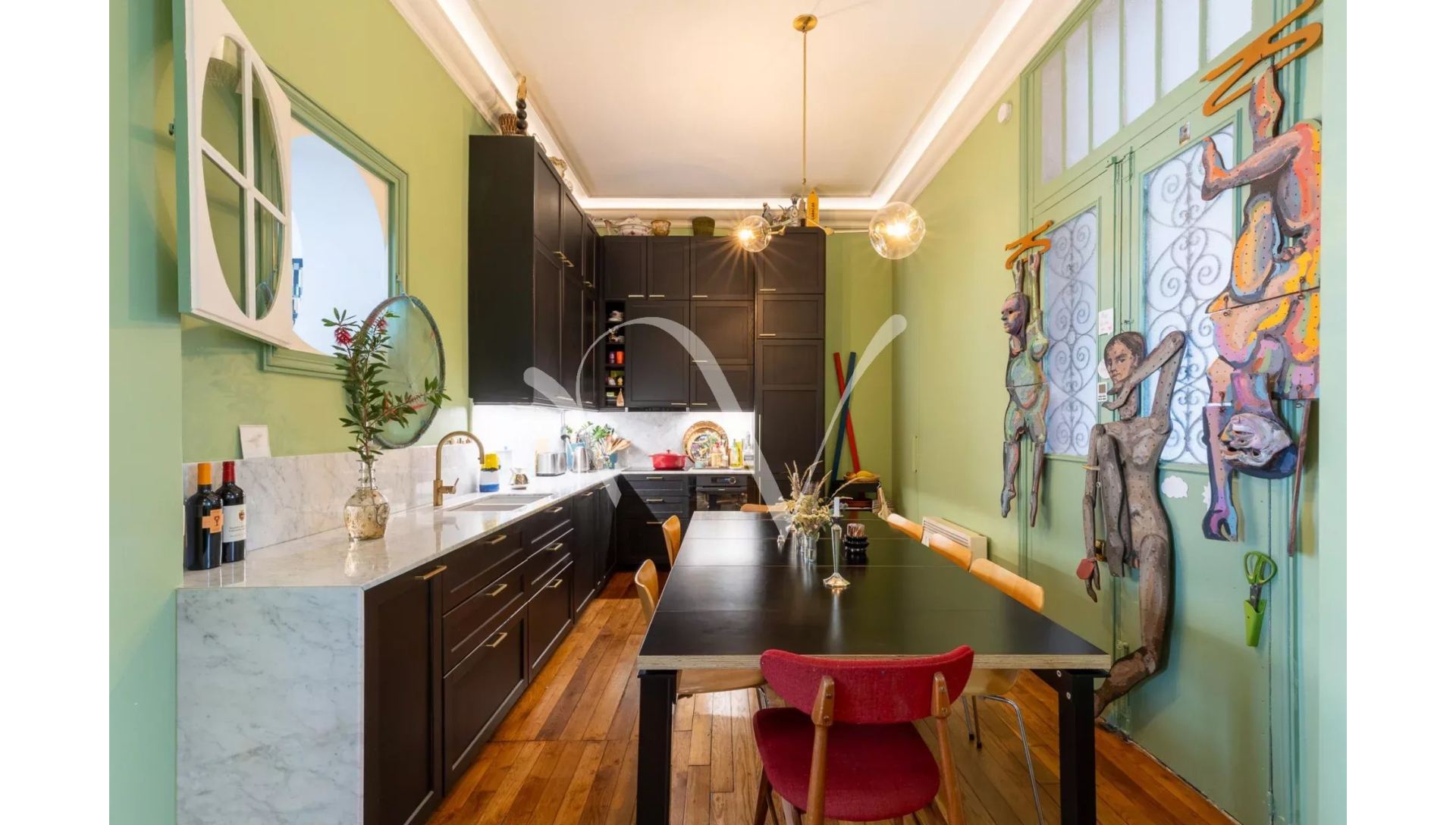 Situé dans un bel immeuble en pierre de taille, cet appartement de 130 m² offre une très grande hauteur sous plafond de 3,50 m. Il est situé au rez-de-chaussée et comprend une entrée qui dessert une grande cuisine superbement aménagée avec un coin salle à manger, un magnifique salon avec quatre fenêtres exposées au sud, trois chambres, une salle de douche et des toilettes séparées. Un escalier partant de l'appartement mène à une belle cave voûtée.