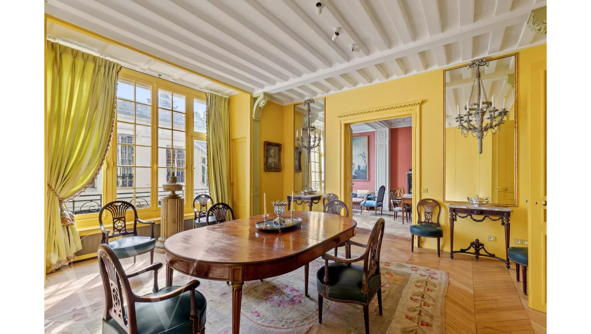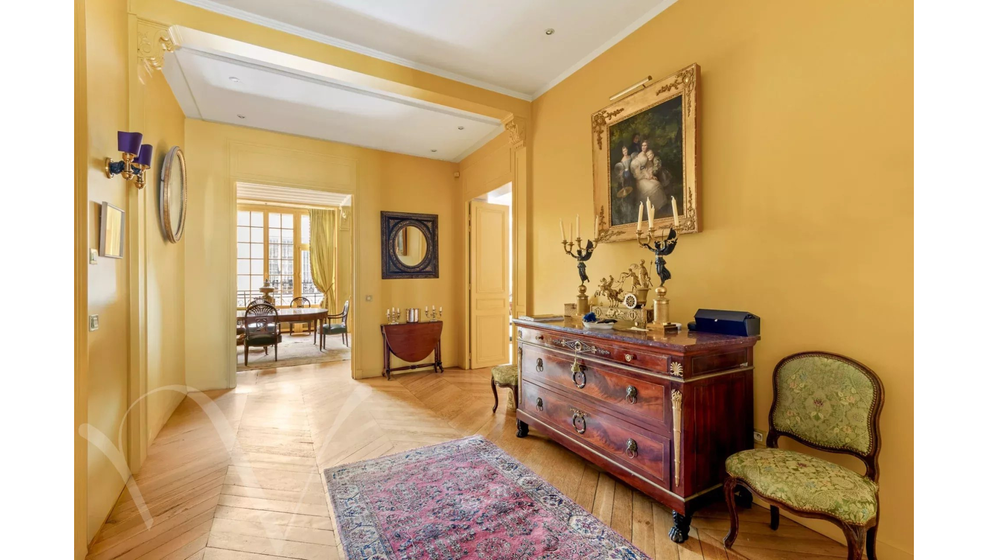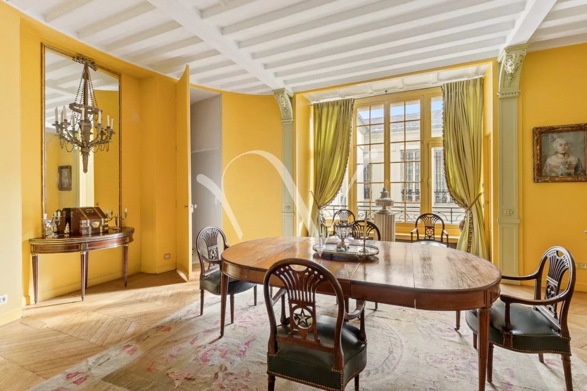 Co-exclusivité. Dans une élégante copropriété fin XVIIIe, au premier étage noble accessible par ascenseur, un appartement traversant de 190,74 m² loi Carrez, il comprend une galerie d'entrée ouvrant sur un salon, un petit salon, une salle à manger avec rangement, trois chambres, dont une suite parentale avec dressing, salle de bains complète, une salle de douche et toilette, une vaste cuisine familiale. Eléments d'origine conservés (parquet Versailles, moulures, cheminées) avec un excellent plan en étoie, de beaux volumes, au calme. Une chambre avec point d'eau au 5e étage de 7.27 m² loi Carrez (9,19 m² au sol)