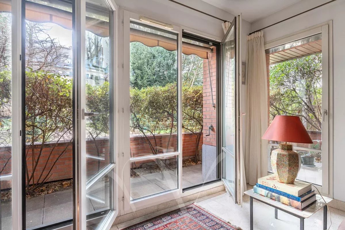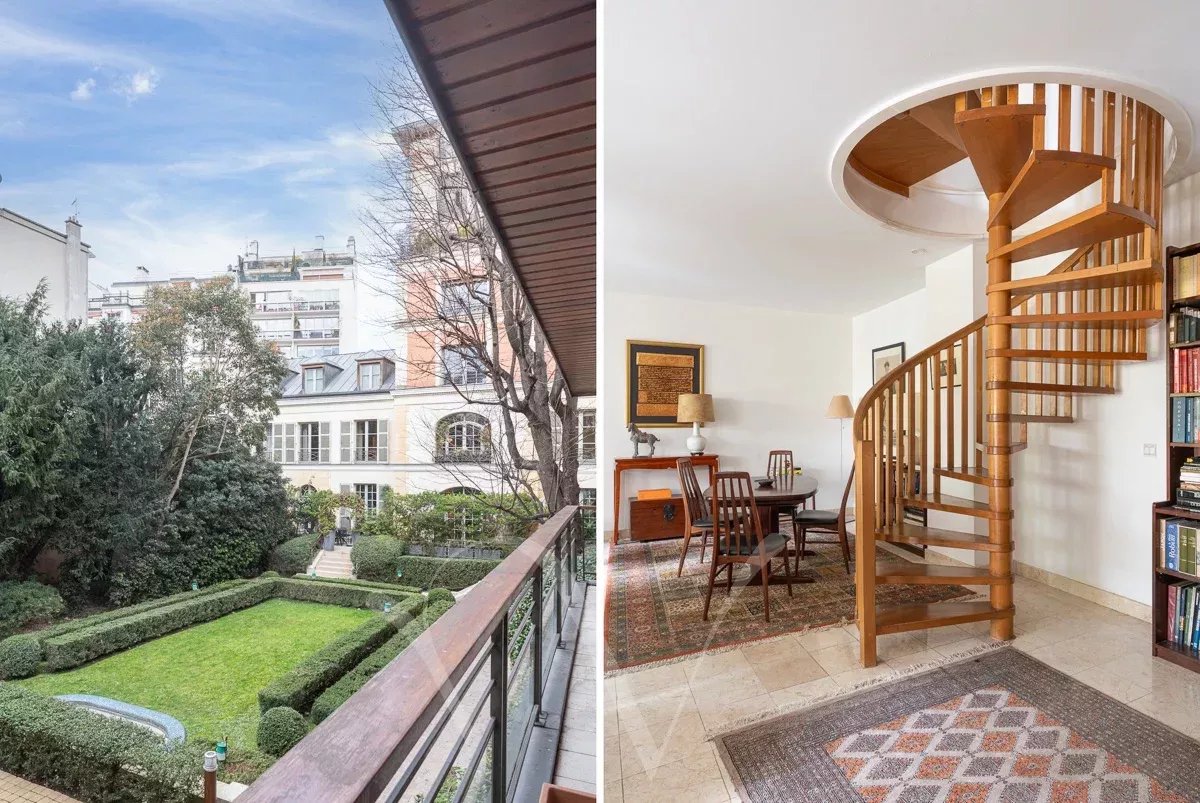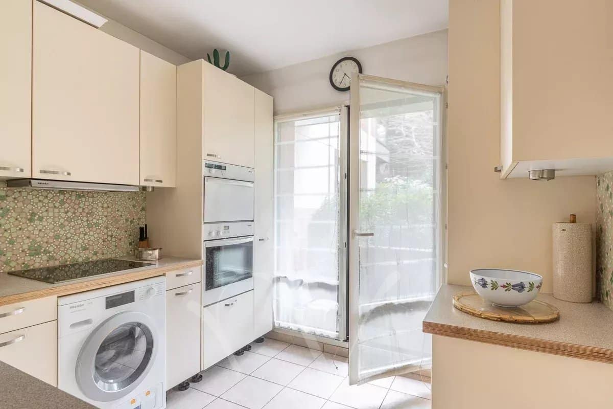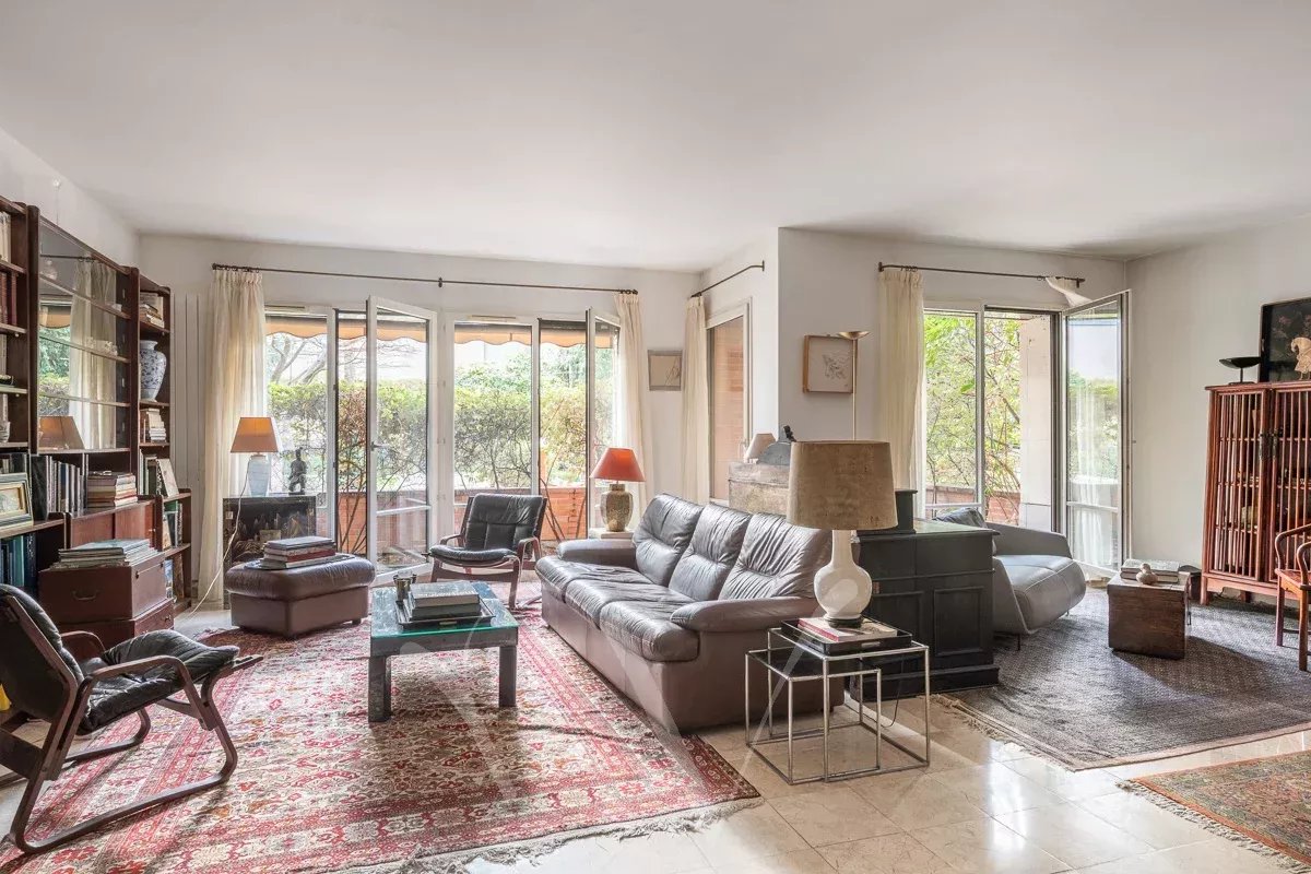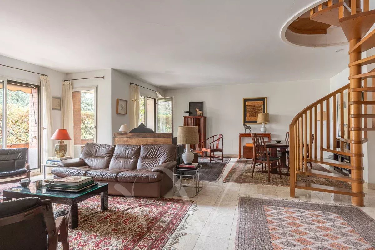 Dans une belle copropriété bien entretenue construite en l’an 2000, duplex en rez de jardin et premier étage de 135,31 m² loi Carrez (136,61 m² au sol) qui se compose d’une entrée ouvrant sur une cuisine, un vaste séjour le tout donnant sur un extérieur privatif, par escalier intérieur accès à trois chambres, une salle de bain avec toilette, dont une chambre principale ou studio indépendant de 30 m² avec salle d’eau et toilette, le tout ouvrant sur un large balcon terrasse de 18 m² offrant des vues sur le jardin de la copropriété. Calme absolu. Un parking en sous-sol pour 60 000 € et deux caves complètent ce bien. Gardien à demeure. Travaux de raffraichissement à prévoir. Le plan de l’appartement peut être inversé, en créant les réceptions au premier étage avec terrasse, et les chambres en rez de jardin.