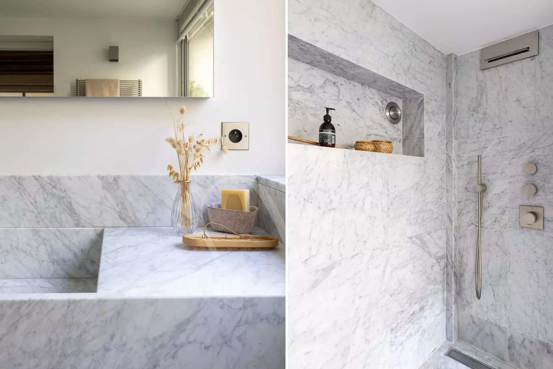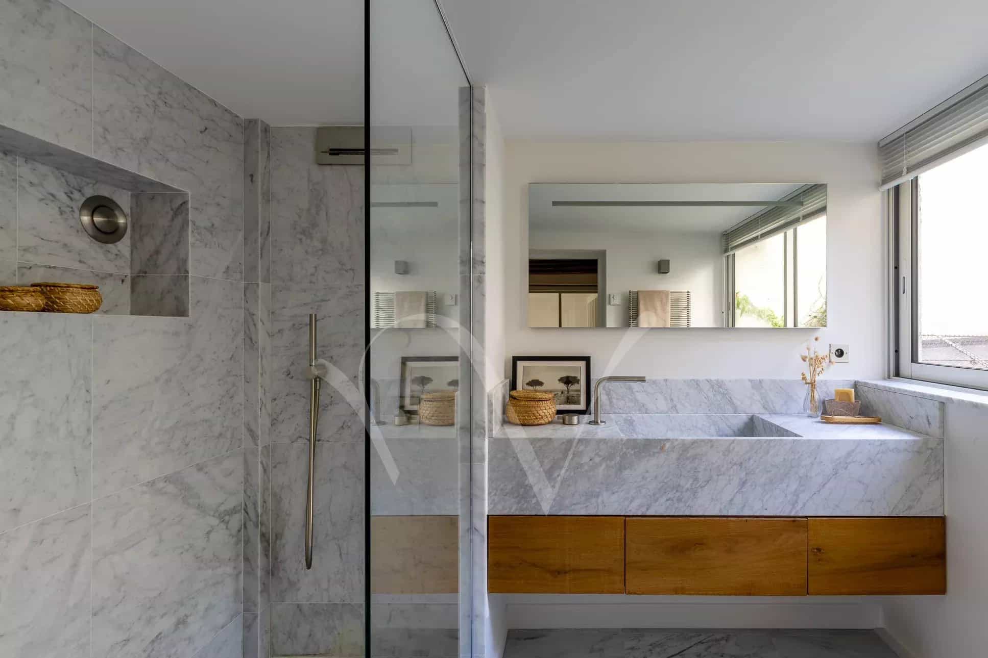 Le plan comprend une entrée, une cuisine salle à manger toute équipée, un salon et deux chambres avec chacune sa salle de bain et toilettes. L’appartement a été très joliment rénové avec des prestations luxueuses (matériaux de qualité, domotique etc.)