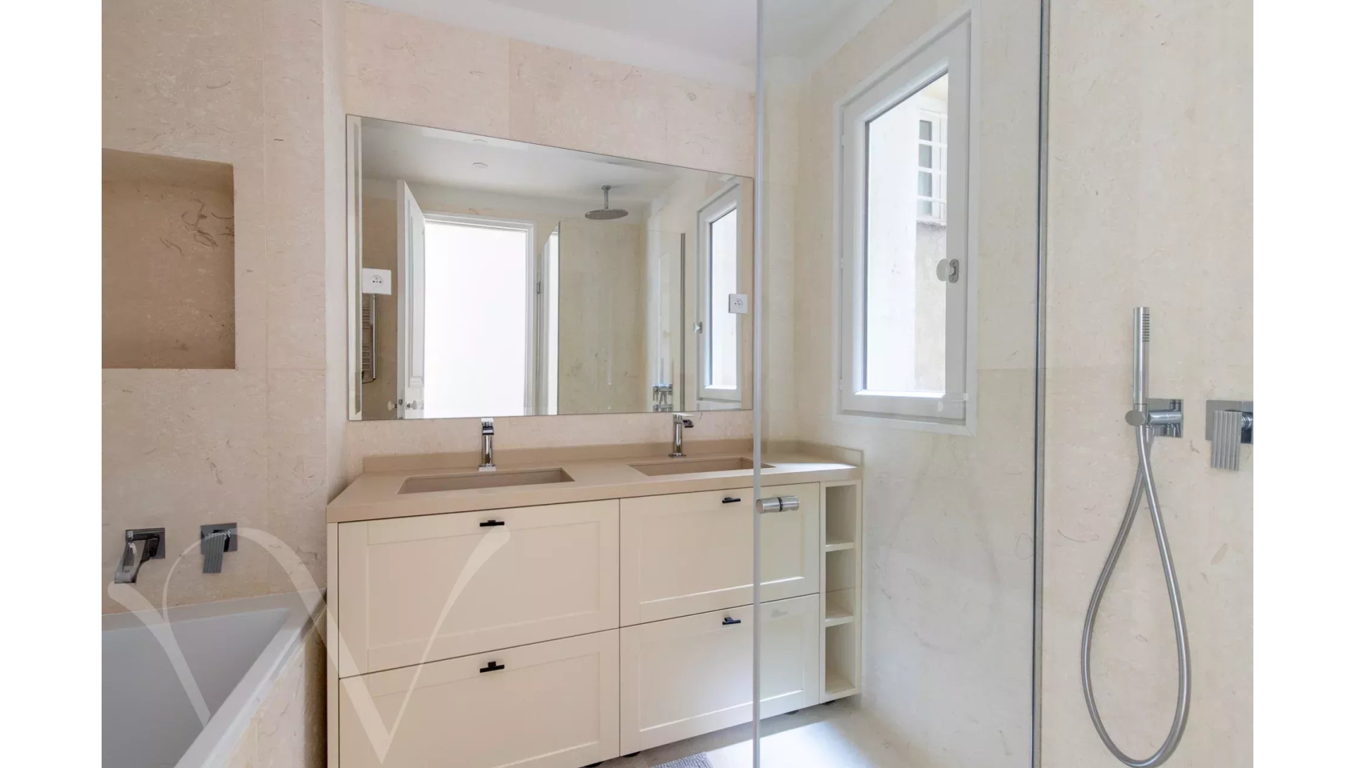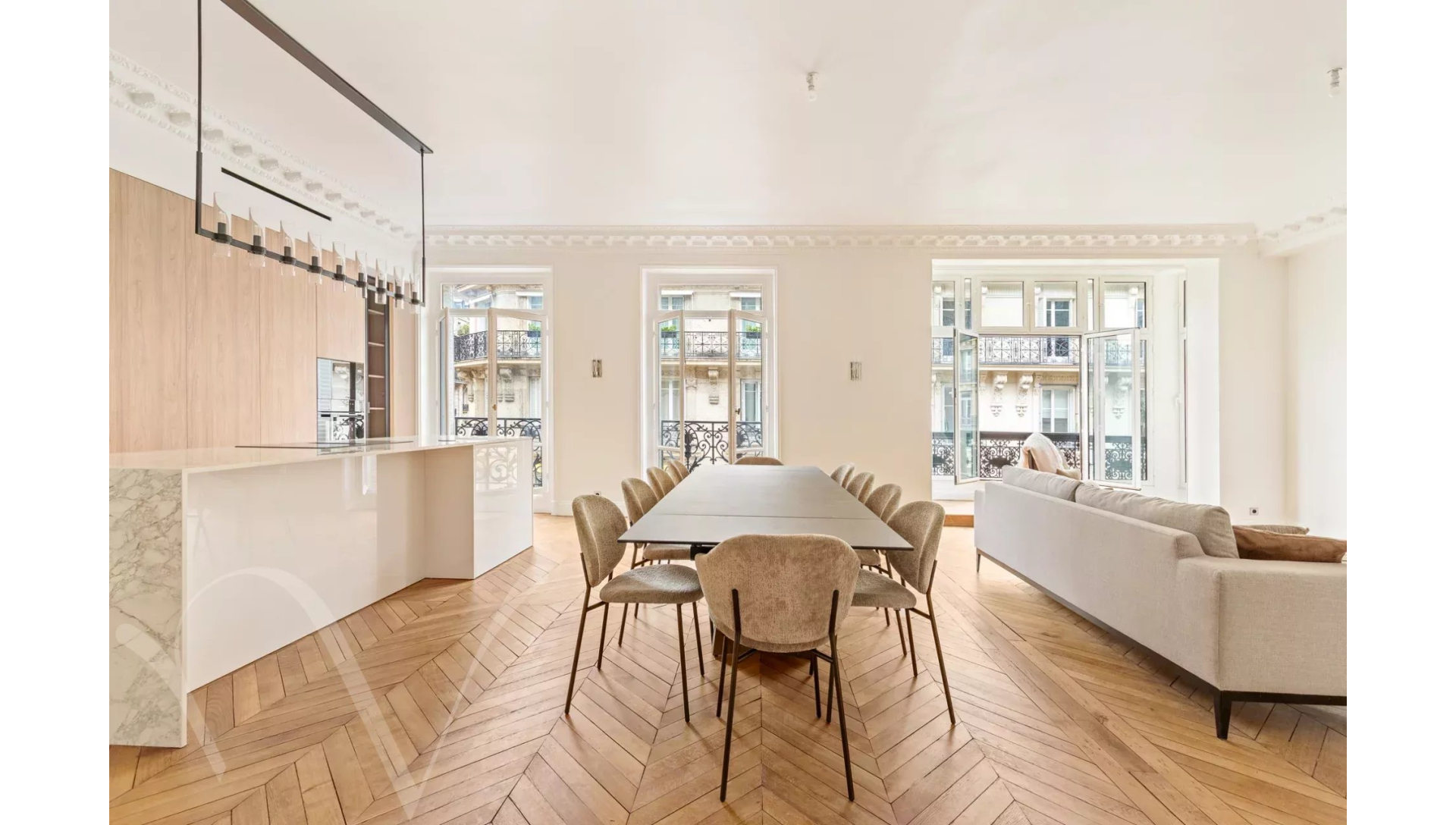 En plein cœur du triangle d'Or et au troisième étage avec ascenseur d'un très bel immeuble en pierre de taille, un appartement intégralement refait et climatisé de 191,71 m² au sol et 186,58 m² loi Carrez composé d'une entrée, un grand salon avec bow-window et cuisine ouverte, trois chambres, une salle de bains, deux salles d'eau et une buanderie.