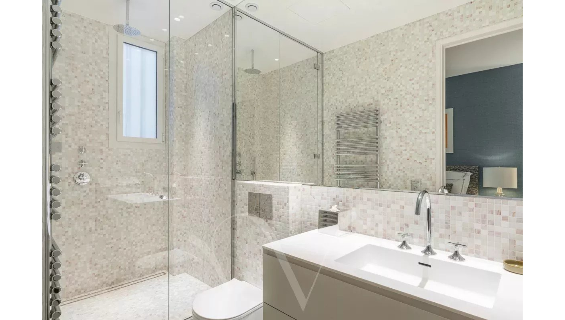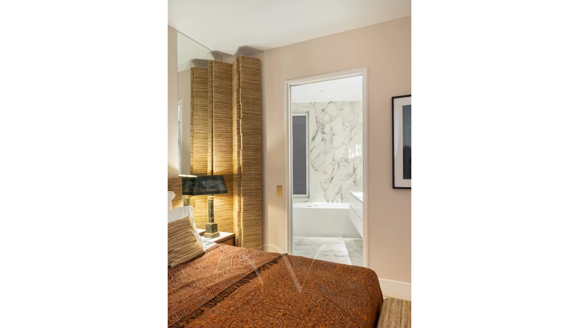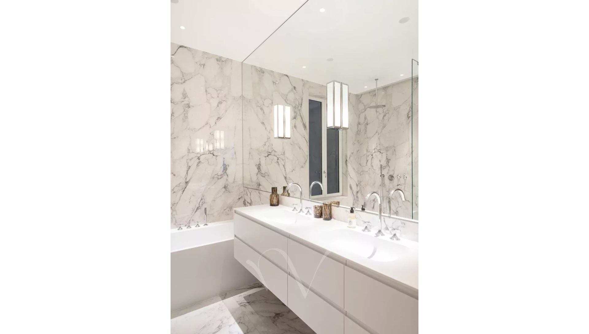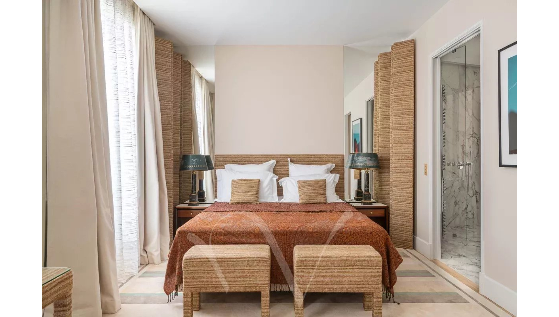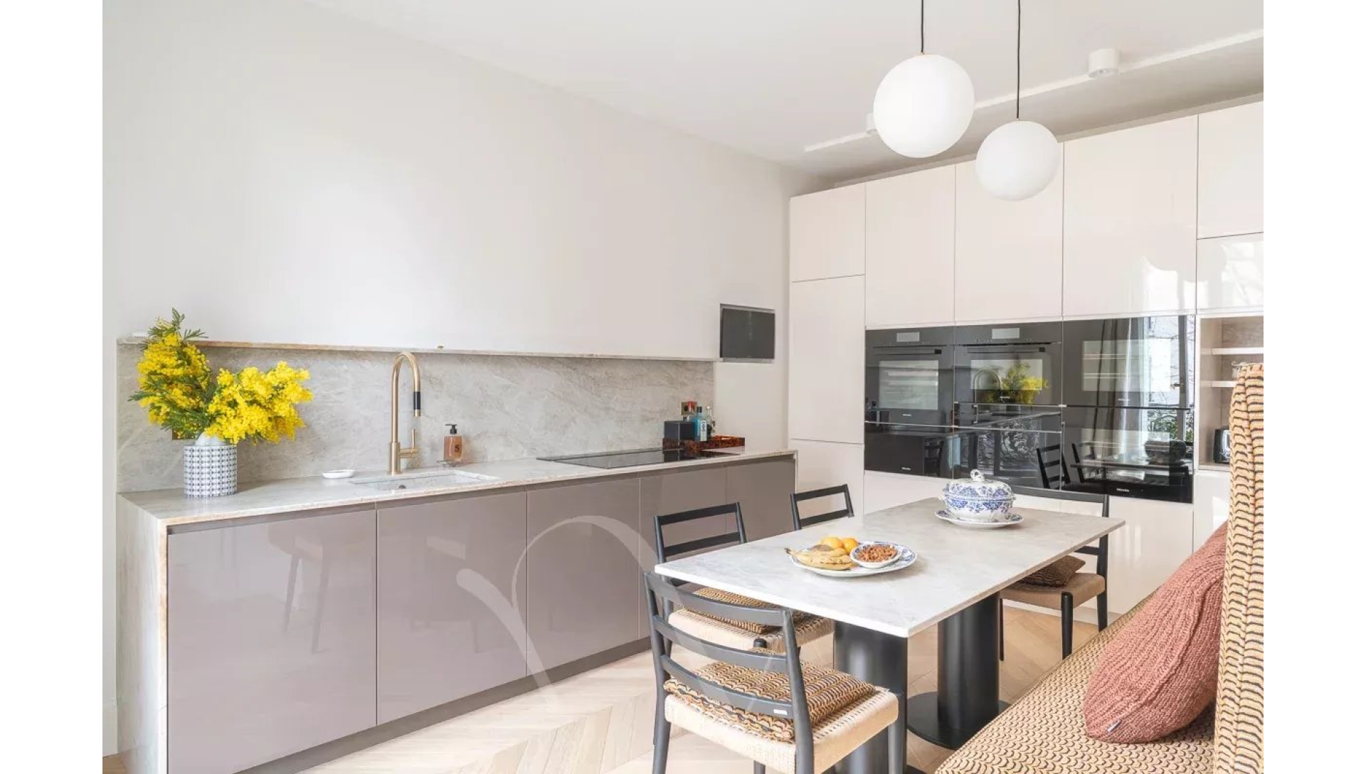 Ayant bénéficié d'une rénovation très luxueuse, l'appartement offre un plan parfait avec une entrée desservant un salon double avec trois portes-fenêtres donnant sur un balcon filant, une salle à manger avec une cuisine ouverte, deux chambres en suite avec chacune sa salle de bains complète, une buanderie et des toilettes séparées.