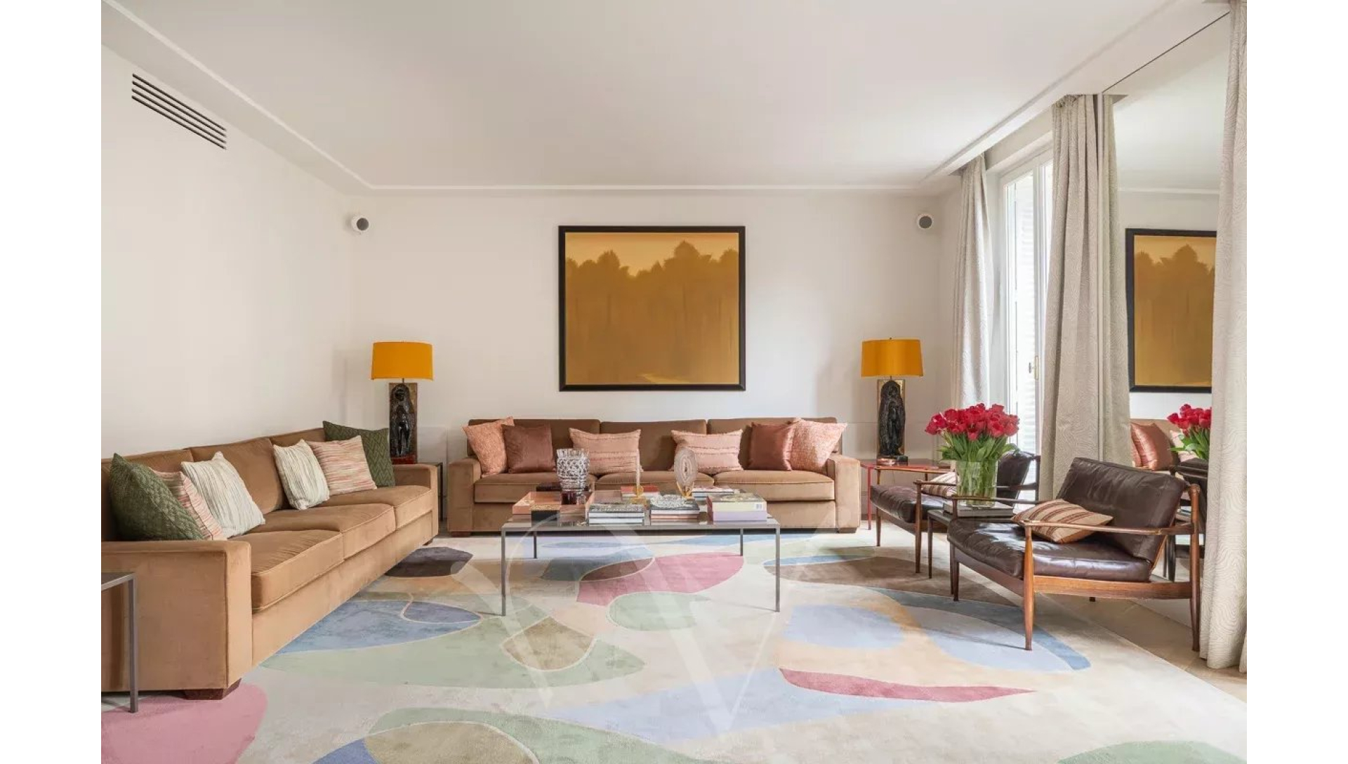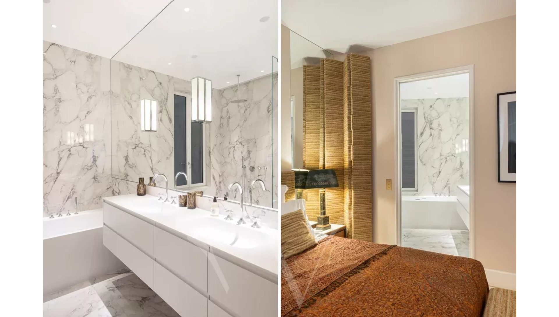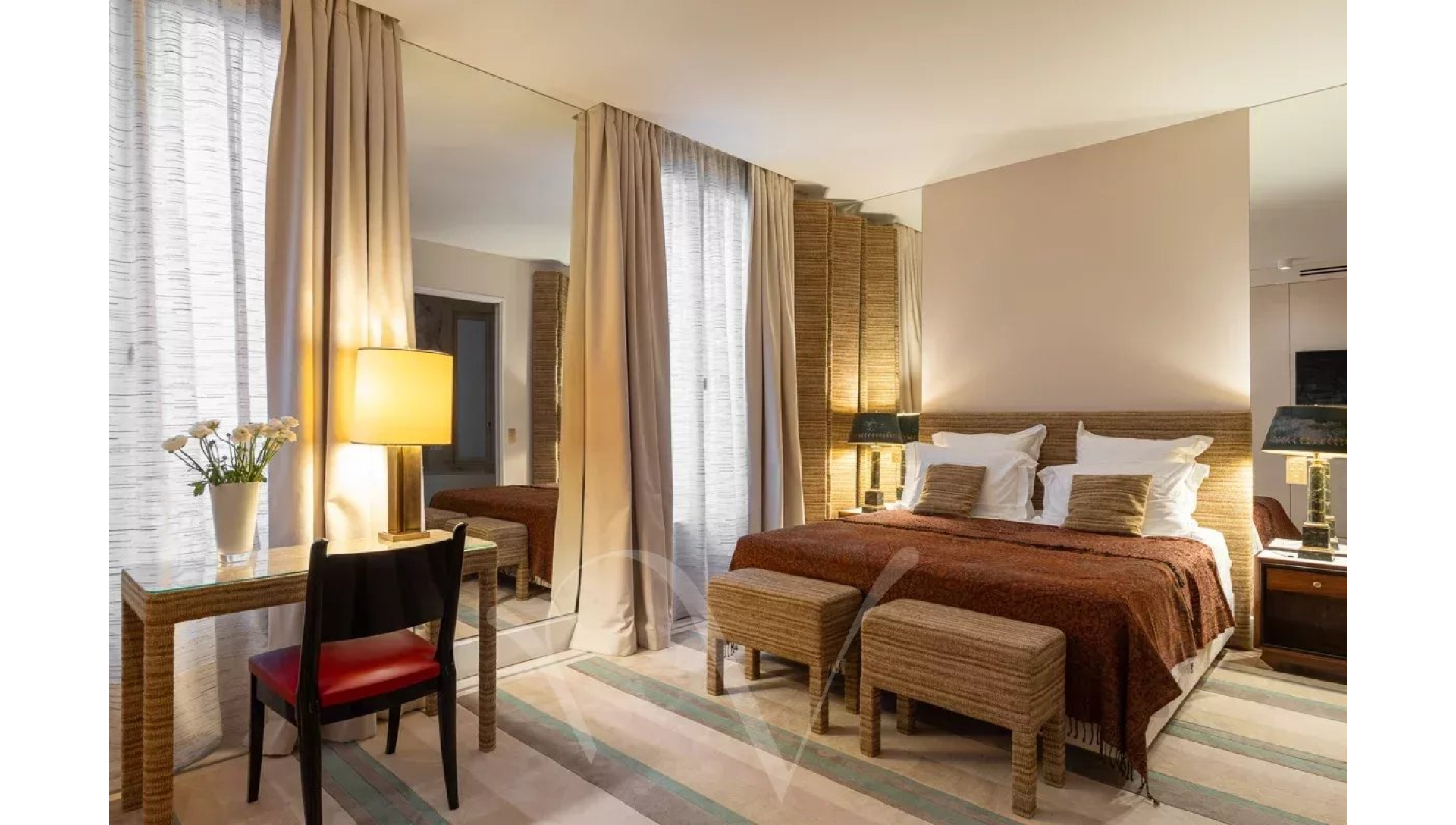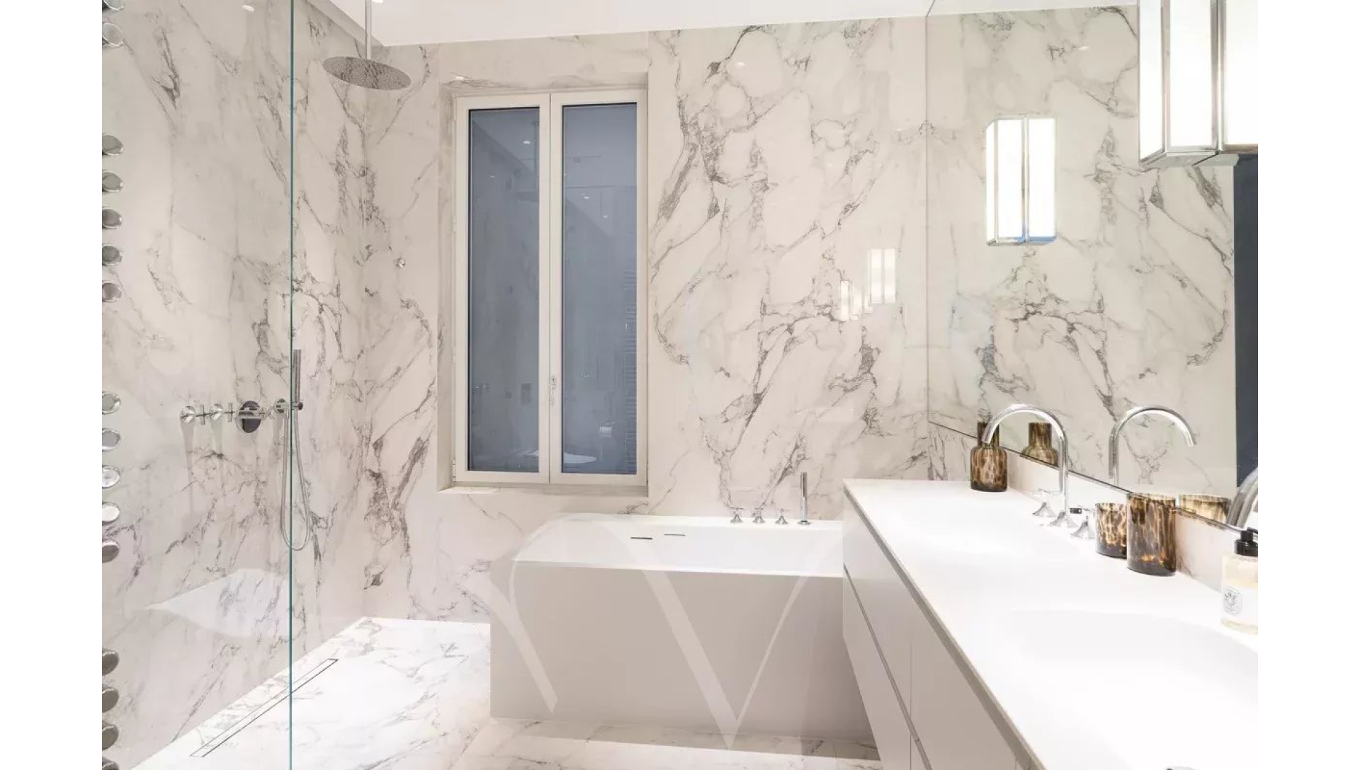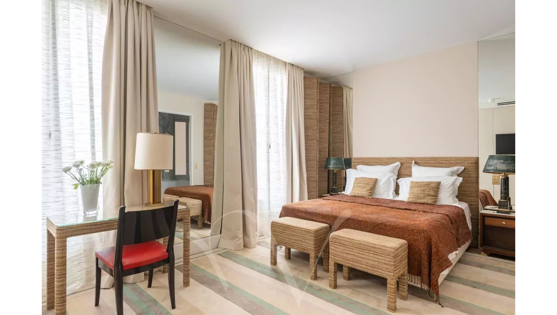 Ayant bénéficié d'une rénovation très luxueuse, l'appartement offre un plan parfait avec une entrée desservant un salon double avec trois portes-fenêtres donnant sur un balcon filant, une salle à manger avec une cuisine ouverte, deux chambres en suite avec chacune sa salle de bains complète, une buanderie et des toilettes séparées.