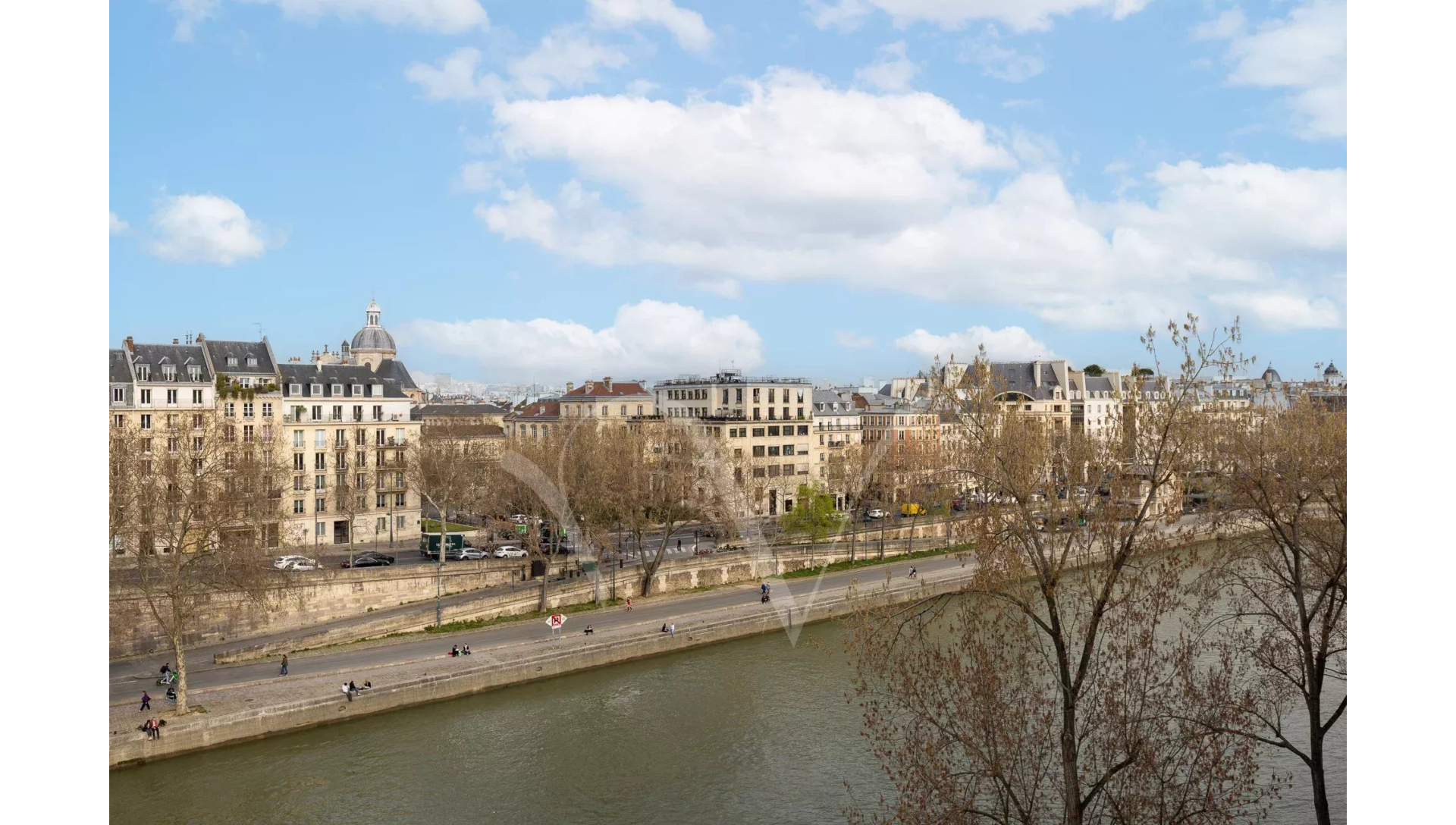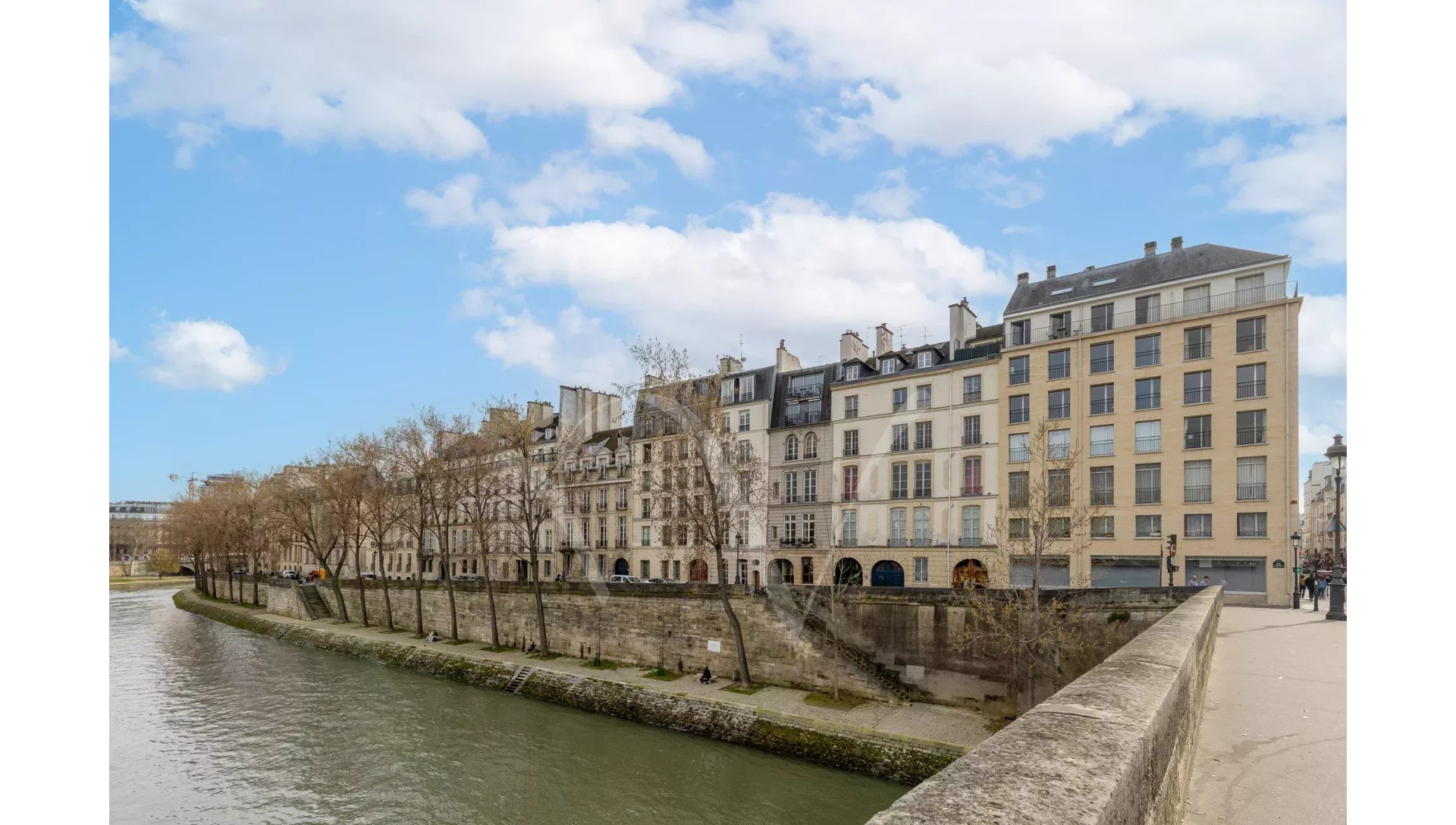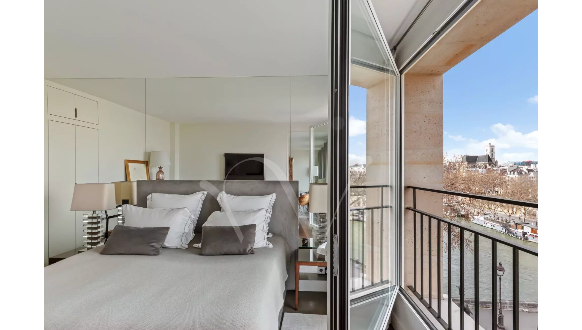 Dans un bel immeuble récent, au cinquième étage desservi par un grand ascenseur, magnifique appartement de 65 m² composé d'un salon avec trois grandes portes-fenêtres donnant sur la Seine, une belle chambre, une grande salle de douche avec WC, une cuisine équipée et des toilettes d'invités.
